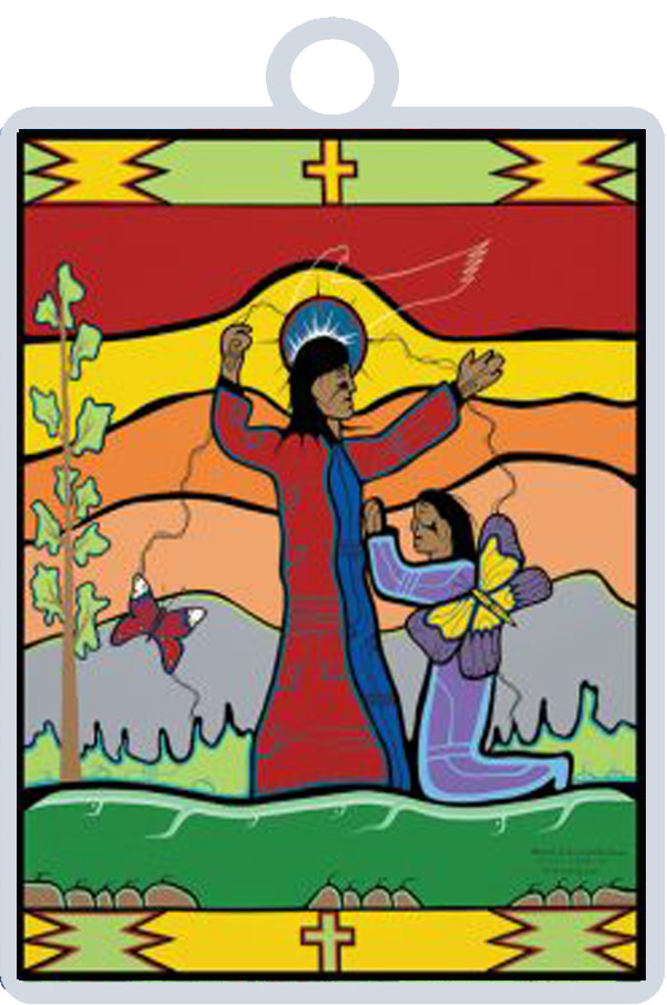 This pendant/charm features the work of Cree artist Ovide Joseph Bighetty, entitled Because He Lives, We Can Face Tomorrow. Wear as a reminder of that promise.